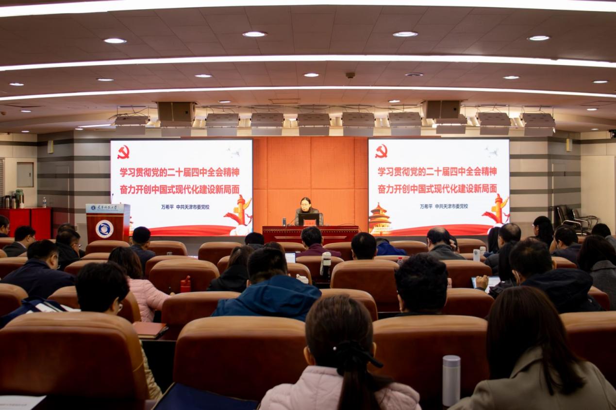 近日,我校在河西校区主楼C区报告厅举办学习贯彻党的二十届四中全会精神专题报告会暨党委理论学习中心组(扩大)会议。天津市委党校哲学教研部万希平教授应邀作报告。校领导、全体中层干部180余人参加。报告会由校党委副书记贾启君主持。