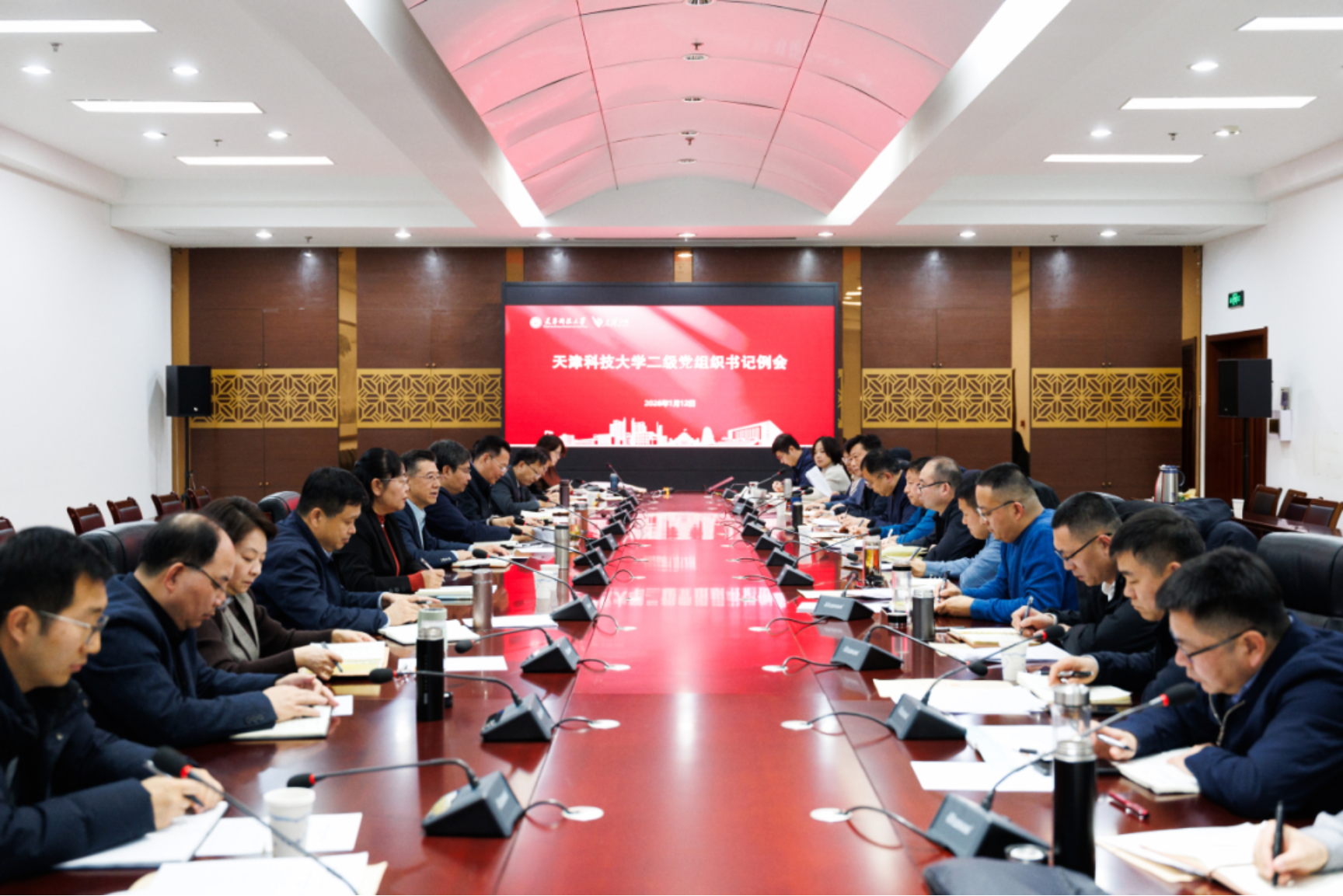 2026年1月12日,天津科技大学召开2026年首次二级党组织书记例会,聚焦“十五五”规划开局与“先锋计划”迭代升级关键节点,统一思想、部署任务、凝聚合力。校党委书记白海力出席会议并讲话,校党委副书记贾启君、派驻纪检监察组组长李蓉,各党务部门负责同志以及基层党委、党总支、直属党支部书记参加会议。